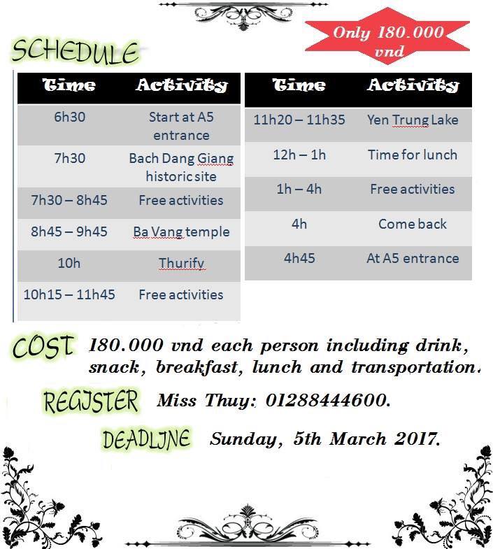 Hoạt động này của CLB đã được lên kế hoạch kĩ lưỡng 2 tuần trước khi chọn ngày chính thức và bắt đầu thực hiện vào 1 tuần trước ngày đi, tức vào ngày thứ ba 28/02. Chuyến tham quan du lịch sẽ hướng tới 3 nơi chính là: Khu di tích lịch sử Bạch Đằng Giang, Chùa Ba Vàng và hồ Yên Trung. Cả đoàn sẽ khởi hành ở cổng chính của trường Đại học Hàng Hải và di chuyển bằng ô tô.