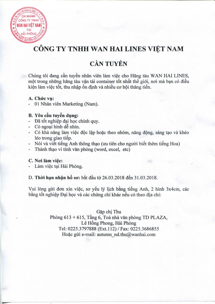 Viện ĐTQT trân trọng thông báo thông tin tuyển dụng của CÔNG TY TNHH WAN HAI LINES VIỆT NAM