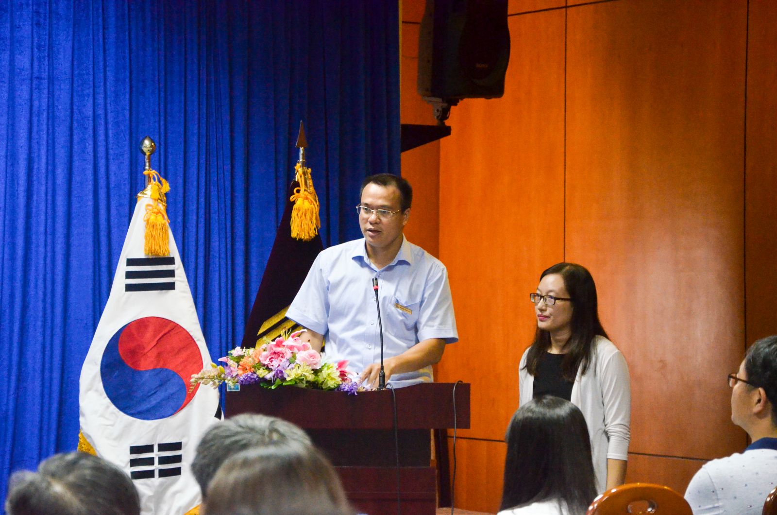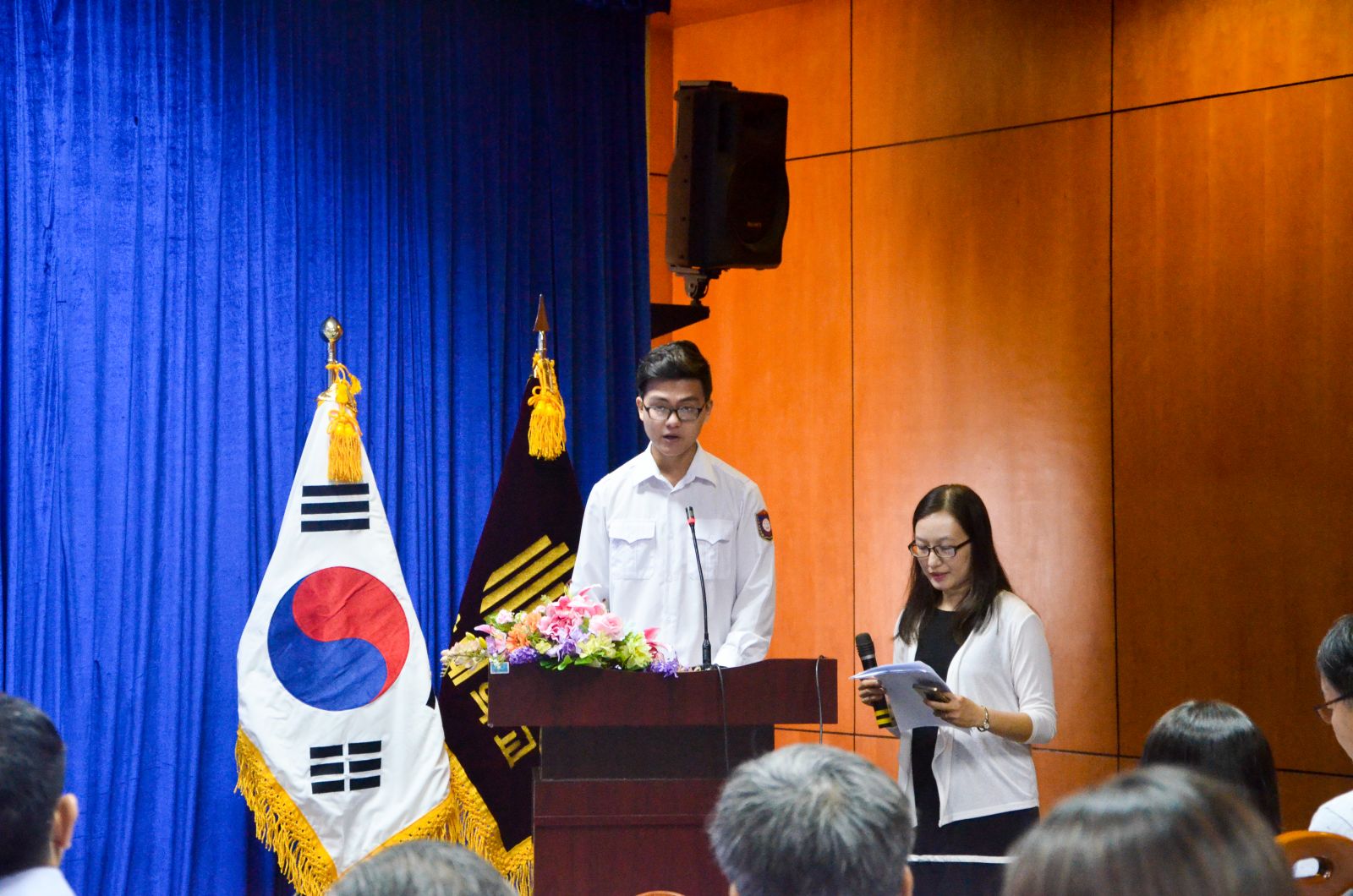 SV. Đinh Cường Thịnh (GMA05) phát biểu trong buổi lễ về mối quan tâm đến việc học Tiếng Hàn của SV trường ĐHHH