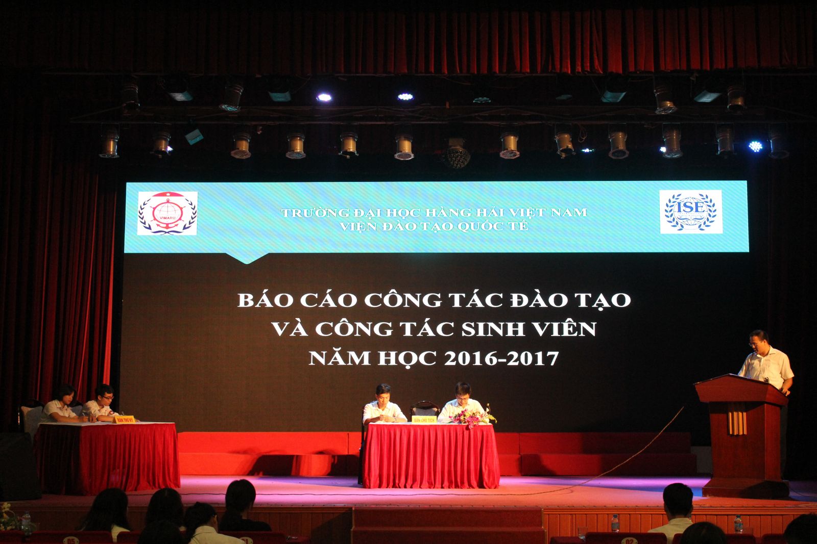 Thầy TS. Nguyễn Minh Đức đang đọc báo cáo công tác đào tạo và công tác sinh viên năm học 2016 - 2017.