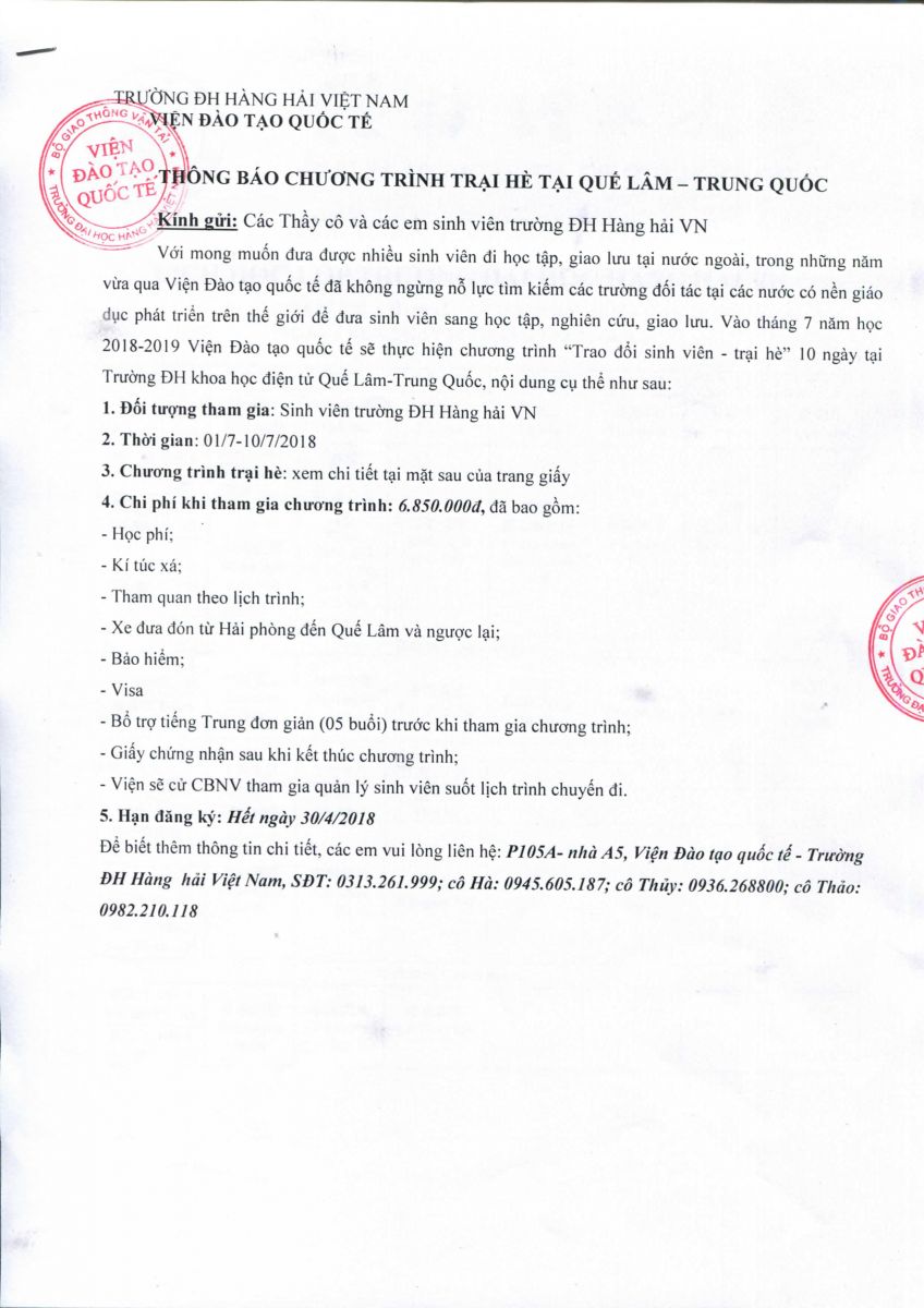 Viện ĐTQT thông báo chương trình trại hè Quế Lâm - Trung Quốc