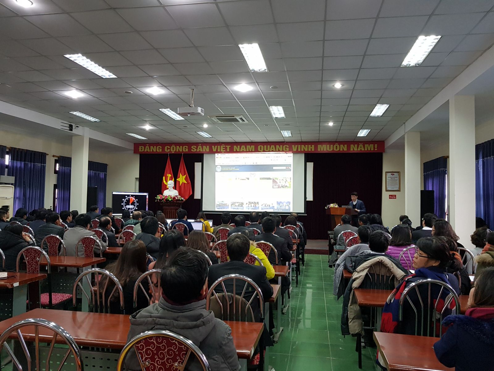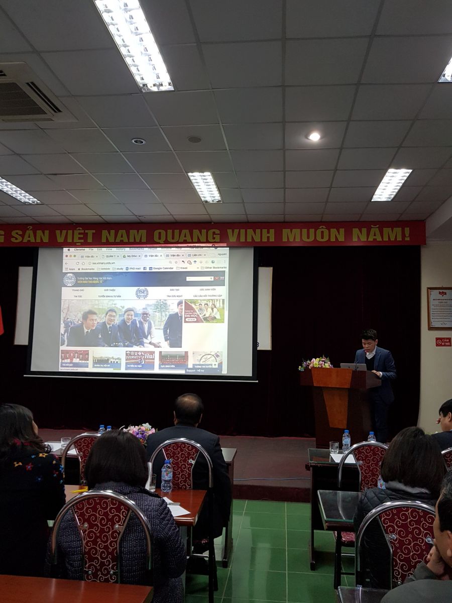 Sáng ngày 30/01/2018, tại Phòng Hội thảo Quốc tế số 3 - trường ĐHHHVN đã diễn ra vòng chung kết Hội thi " Sáng tạo Website " năm 2017. Tại vòng chung kết này, 8 đơn vị tham gia thi sẽ thuyết trình trước ban giám khảo những nội dung khái quát về trang web, những điểm mạnh của trang web và phương hướng sắp tới của ban biên tập trang web của mỗi đơn vị dự định thực hiện để hoàn thiện hơn về hình ảnh và nội dung của trang web. Đại diện cho ban biên tập website Viện ĐTQT thuyết trình đó là TS.Nguyễn Cảnh Lam - giảng viên đang công tác tại Ban đào tạo Viện ĐTQT. Thầy Cảnh Lam đã giới thiệu những phần khái quát về nội dung và hình ảnh trang web. Bên cạnh đó, điểm mạnh của trang web đó là những chuyên mục được sắp xếp rõ ràng, liên mạch và gần gũi với người dùng với 2 phiên bản song song đó là tiếng Việt và tiếng Anh.