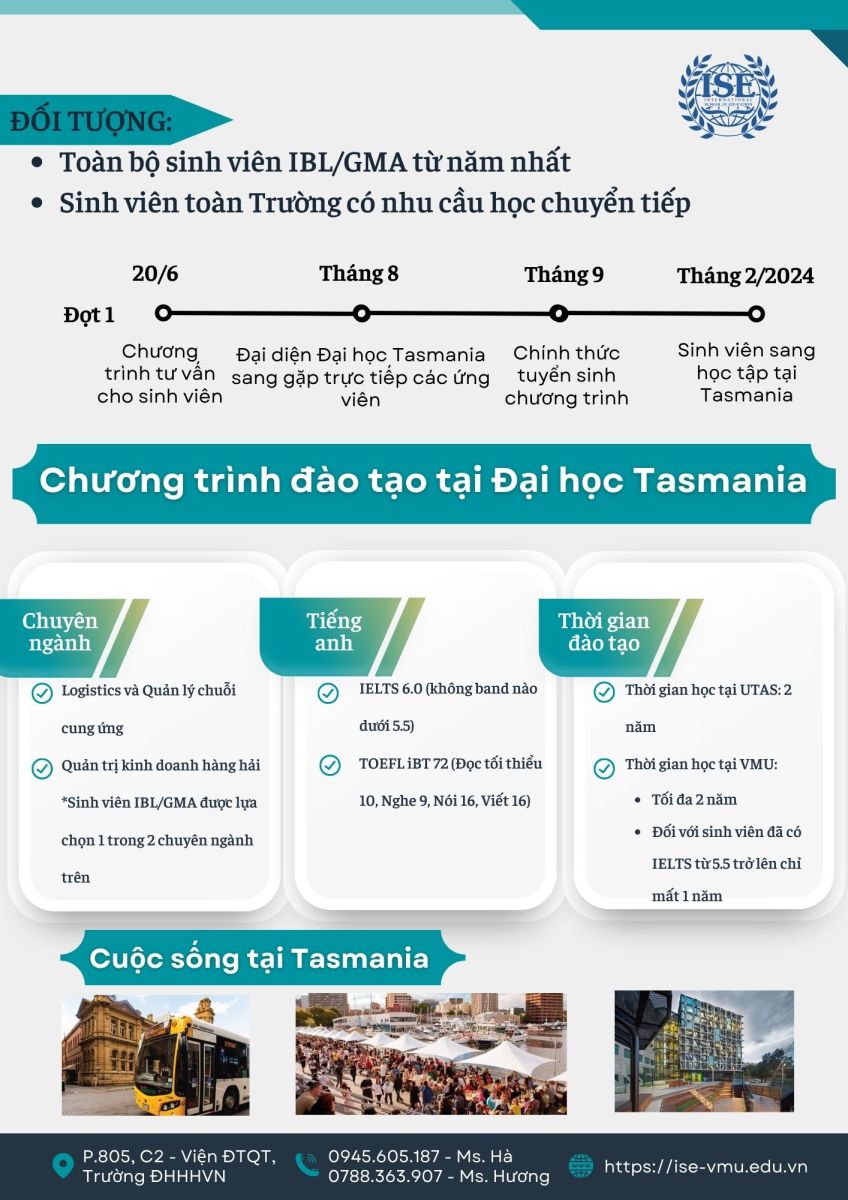Đại học Tasmania (UTAS) là một trong 10 Đại học hàng đầu tại Úc về nghiên cứu và giảng dạy. Trong khuôn khổ hợp tác đào tạo quốc tế, Đại học Tasmania và Đại học Hàng Hải Việt Nam cùng ký kết hợp tác triển khai tuyển sinh chương trình chuyển tiếp 2+2 tại Đại học Tasmania 02 chuyên ngành: